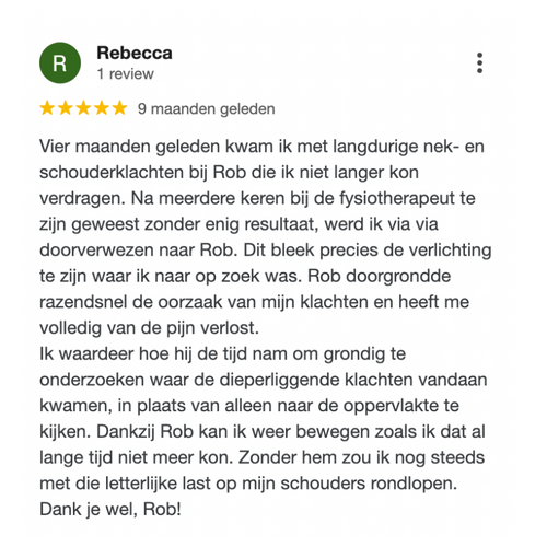 Ik waardeer hoe hij de tijd nam om grondig te onderzoeken waar de dieperliggende klachten vandaan kwamen, in plaats van alleen naar de oppervlakte te kijken. Dankzij Rob kan ik weer bewegen zoals ik dat al lange tijd niet meer kon. Zonder hem zou ik nog steeds met die letterlijke last op mijn schouders rondlopen. Dank je wel, Rob!