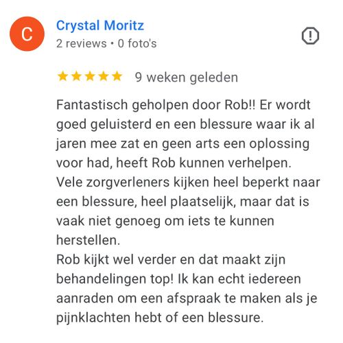 Fantastisch geholpen door Rob!! Er wordt goed geluisterd en een blessure waar ik al jaren mee zat en geen arts een oplossing voor had, heeft Rob kunnen verhelpen.
